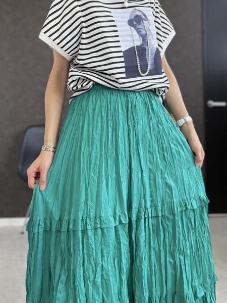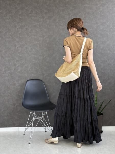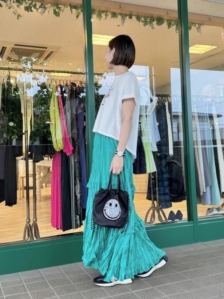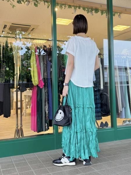 これはもうめちゃくちゃ可愛いし素敵! クシュクシュしたシワ感とフリルがめっちゃかわいい! それでいてすごく軽い。 大人かわいいスカート です。 ここまでのマキシ丈はなかなかないですね。 インソールスニーカーに合わせるといい感じです。
