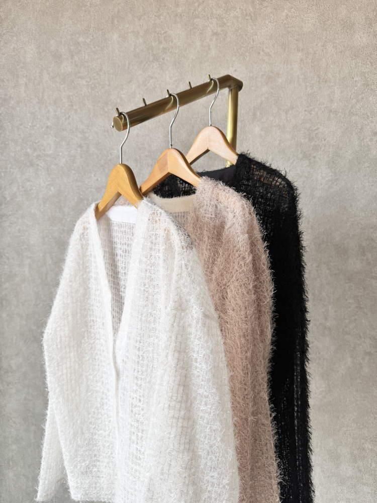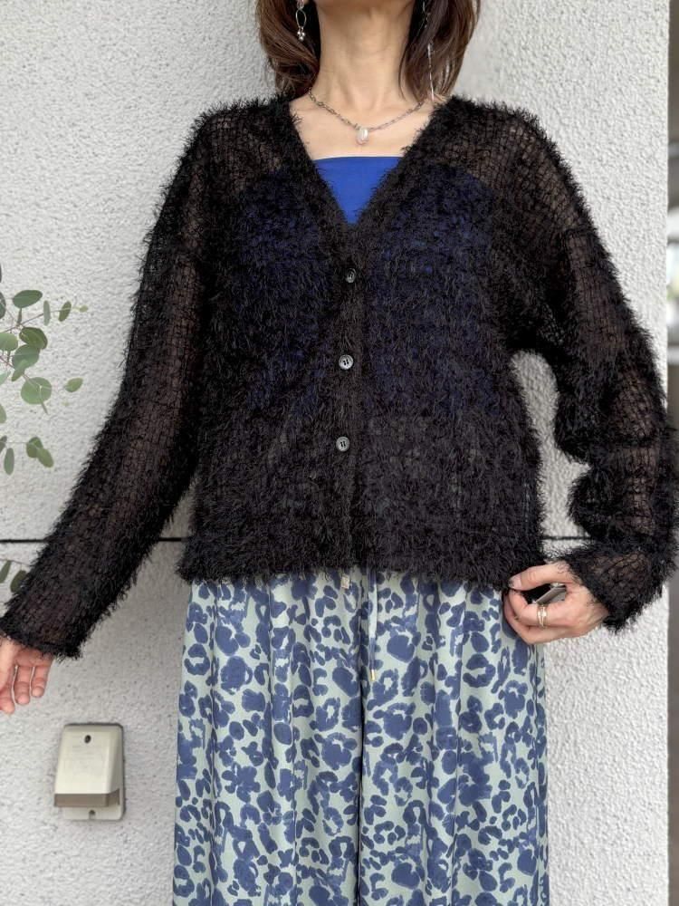 Priority(プライオリティ)格子柄シャギーVネックシアーカーディガン