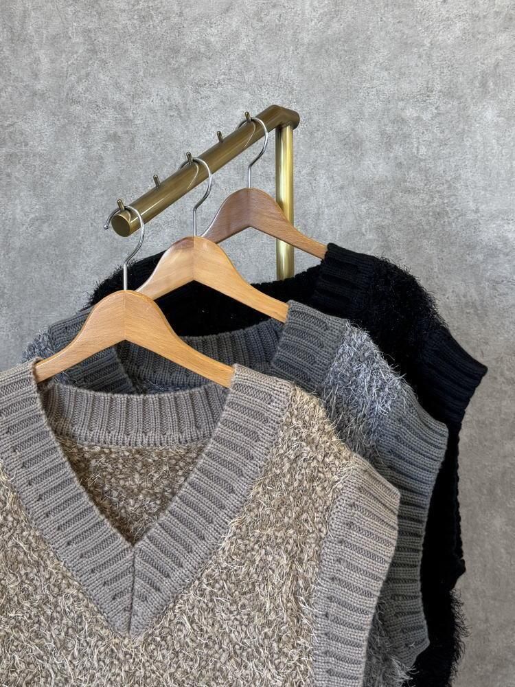グレー購入。チクチクせず、もちもちで肌触りの良いベストです。派手過ぎないキラキラした糸や太めのリブがとても可愛いです。ボトムに前だけインも出来るのでワイドパンツとも相性が良さそう。これから沢山着たいです。