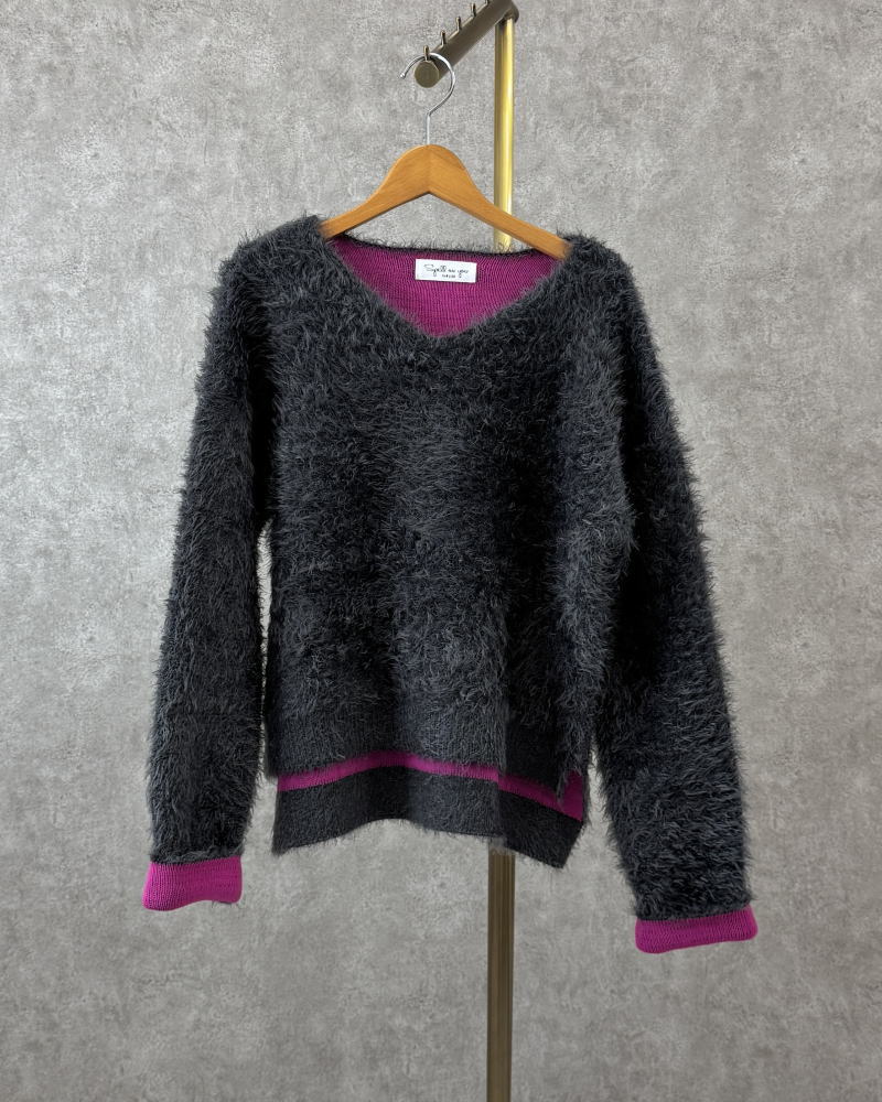 ◇ふわふわ毛長シャギー配色Vネックニット